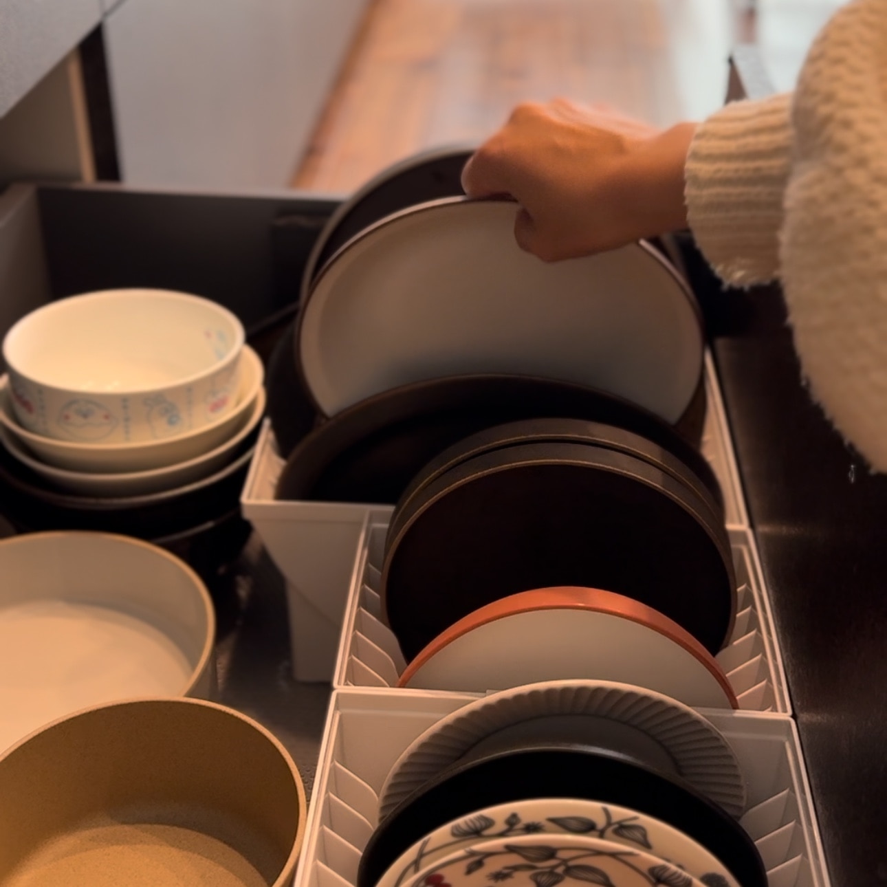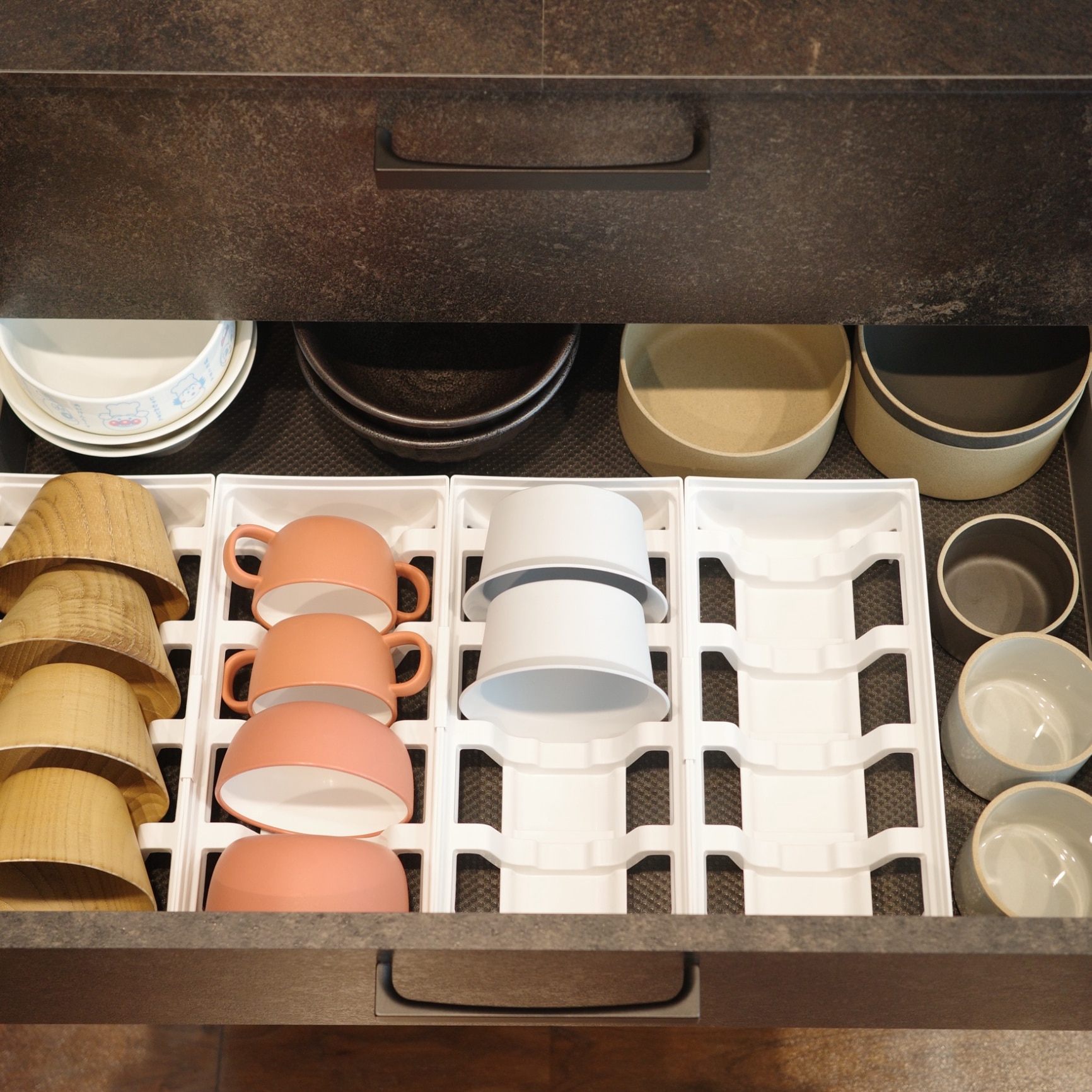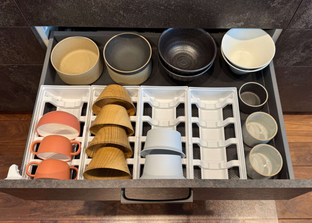 ・ディッシュスタンドのおかげで引き出しを動かしても食器同士がぶつからず、傷つきにくい。