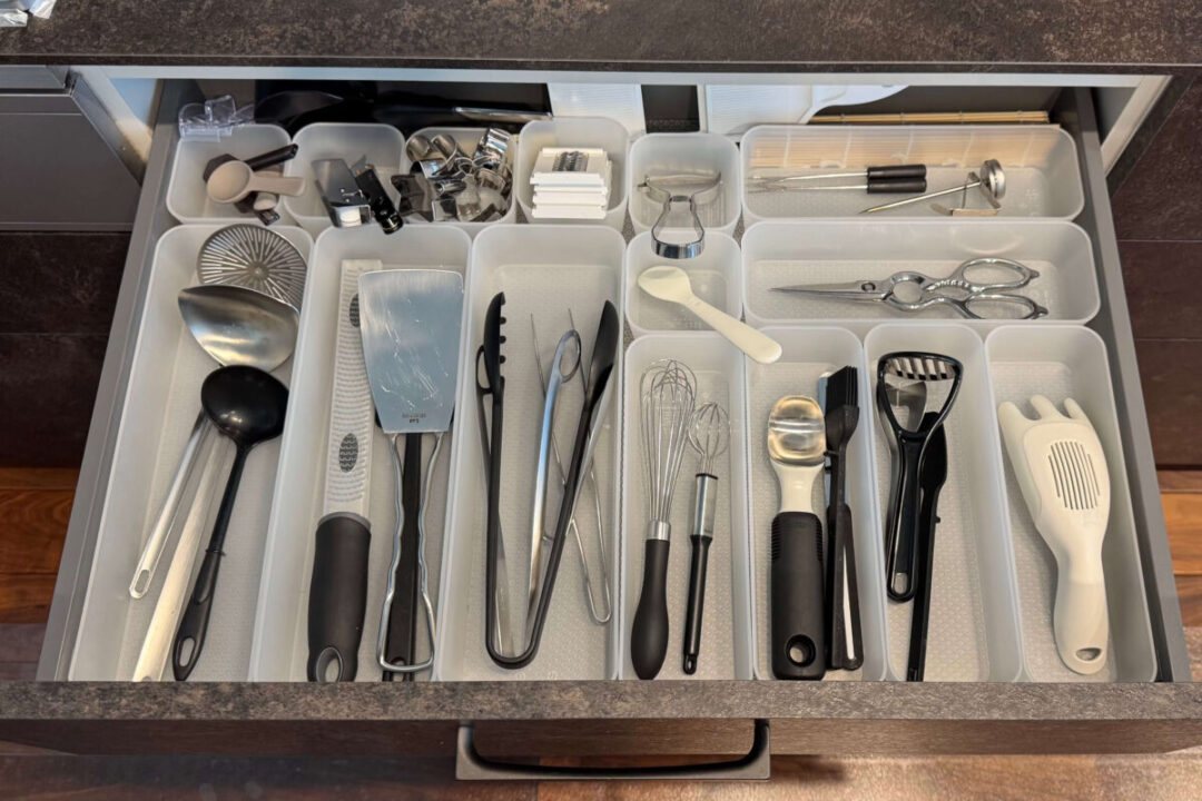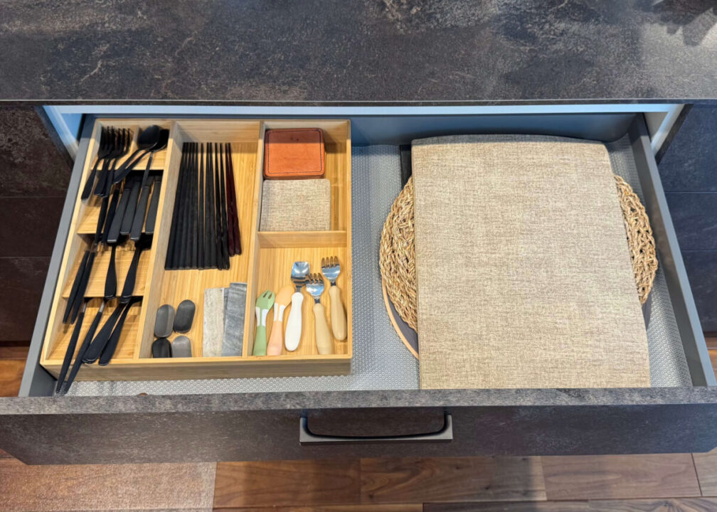 よく使う調理器具やカトラリーは、引き出しを開けてすぐ手が届くように。